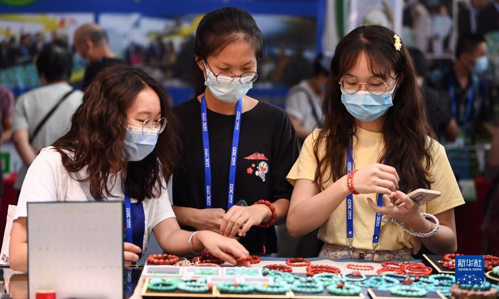 9月19日,年輕人在東博會(huì )緬甸館購買(mǎi)首飾。