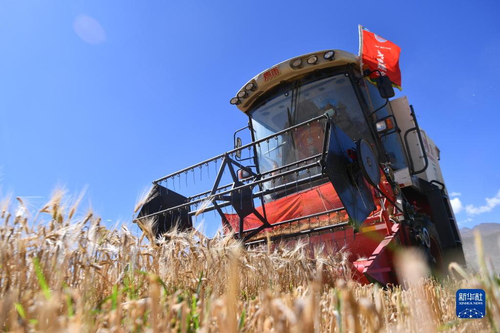 西藏日喀則市江孜縣熱索鄉努康村農機合作社的村民集中對村里三千多畝耕地進(jìn)行機械化收割(9月19日攝)。