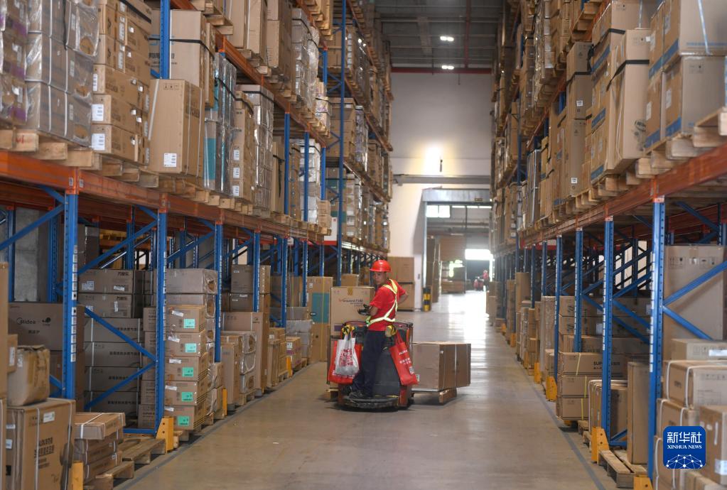 工作人員在位于廣州市開(kāi)發(fā)區的京東倉庫里搬運快遞包裹(9月15日攝)。