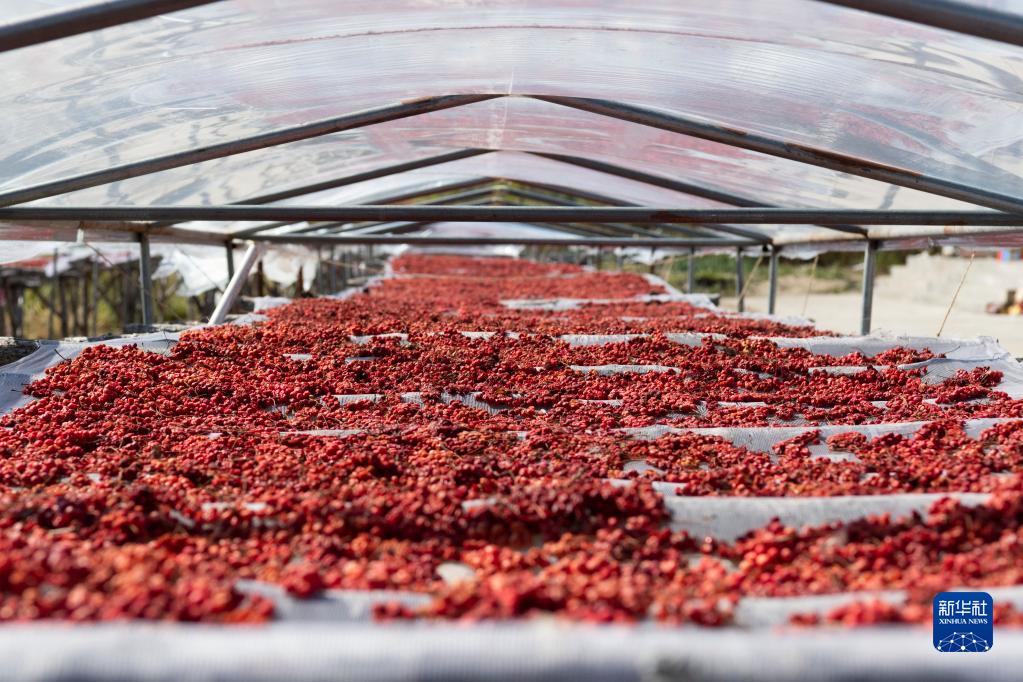 黑龍江勃利縣一中草藥種植基地內晾曬的五味子(9月19日攝)。