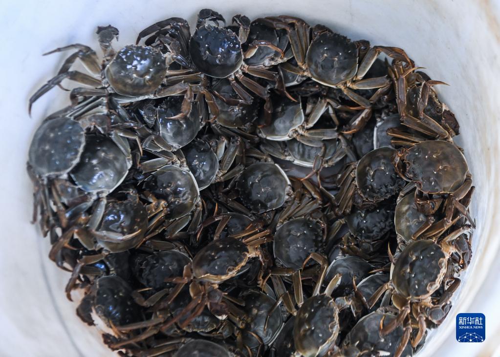 織里鎮喬溇村的溇港人家太湖蟹生態(tài)養殖基地內剛剛捕撈的太湖蟹(9月20日攝)。