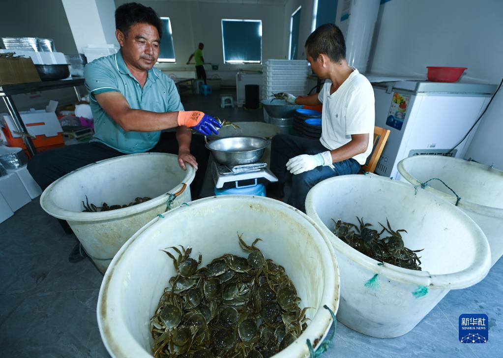 9月20日,在位于織里鎮喬溇村的溇港人家太湖蟹生態(tài)養殖基地內,蟹農們在給捕撈上來(lái)的太湖蟹稱(chēng)重分類(lèi)。