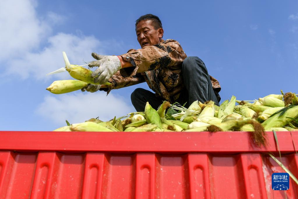 9月20日,在準格爾旗十二連城鄉康布爾村的玉米地里,農民在整理玉米。