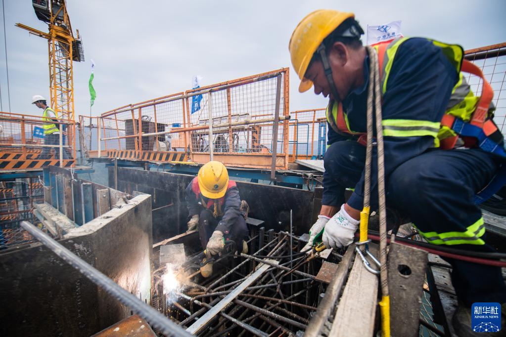 9月20日,在安化縣馬路口資水特大橋施工現場(chǎng),工人在進(jìn)行主墩封頂作業(yè)。