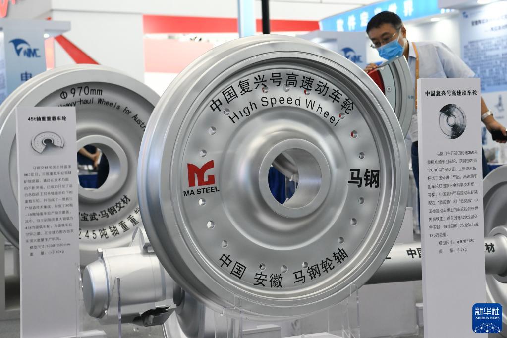 9月20日拍攝的2022世界制造業(yè)大會(huì )上展出的中國復興號高速動(dòng)車(chē)輪模型。