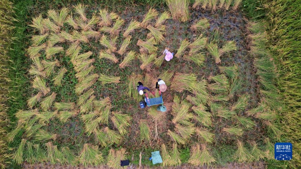 9月11日,貴州省黔東南苗族侗族自治州黎平縣雙江鎮四寨村村民在田間搶收稻谷(無(wú)人機照片)。
