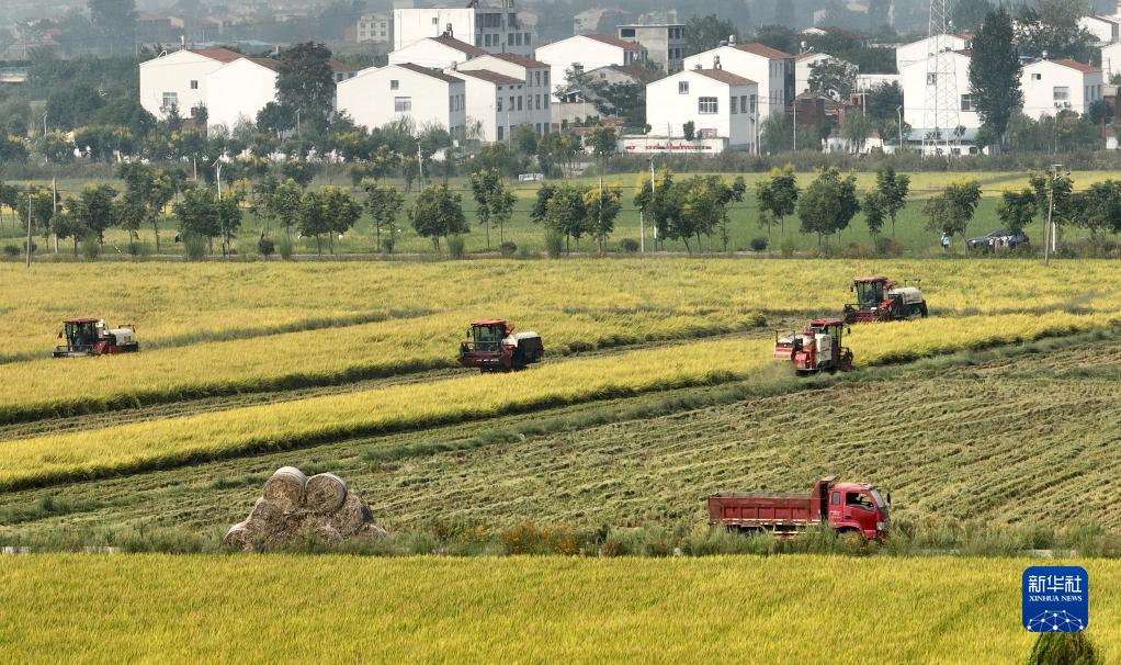 9月14日,在湖北省襄陽(yáng)市襄州區張家集鎮,一家農機專(zhuān)業(yè)合作社的聯(lián)合收割機在收水稻(無(wú)人機照片)。