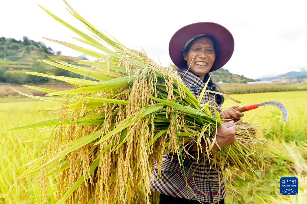 9月15日,云南大理南澗彝族自治縣公郎鎮群眾在收割水稻。