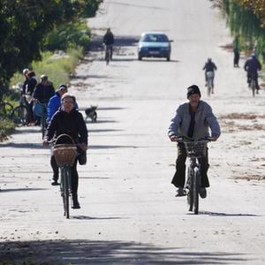 9月19日,在烏克蘭哈爾科夫州伊久姆市,人們騎車(chē)去領(lǐng)取人道主義物資。