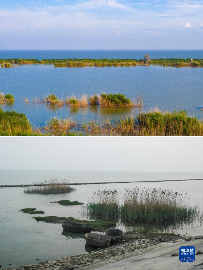 這是一張拼版照片:上圖為2021年7月9日拍攝的位于合肥市包河區的巢湖湖濱濕地風(fēng)景(葉玉庭攝);下圖為2008年4月7日拍攝的巢湖景象(何希斌攝)。