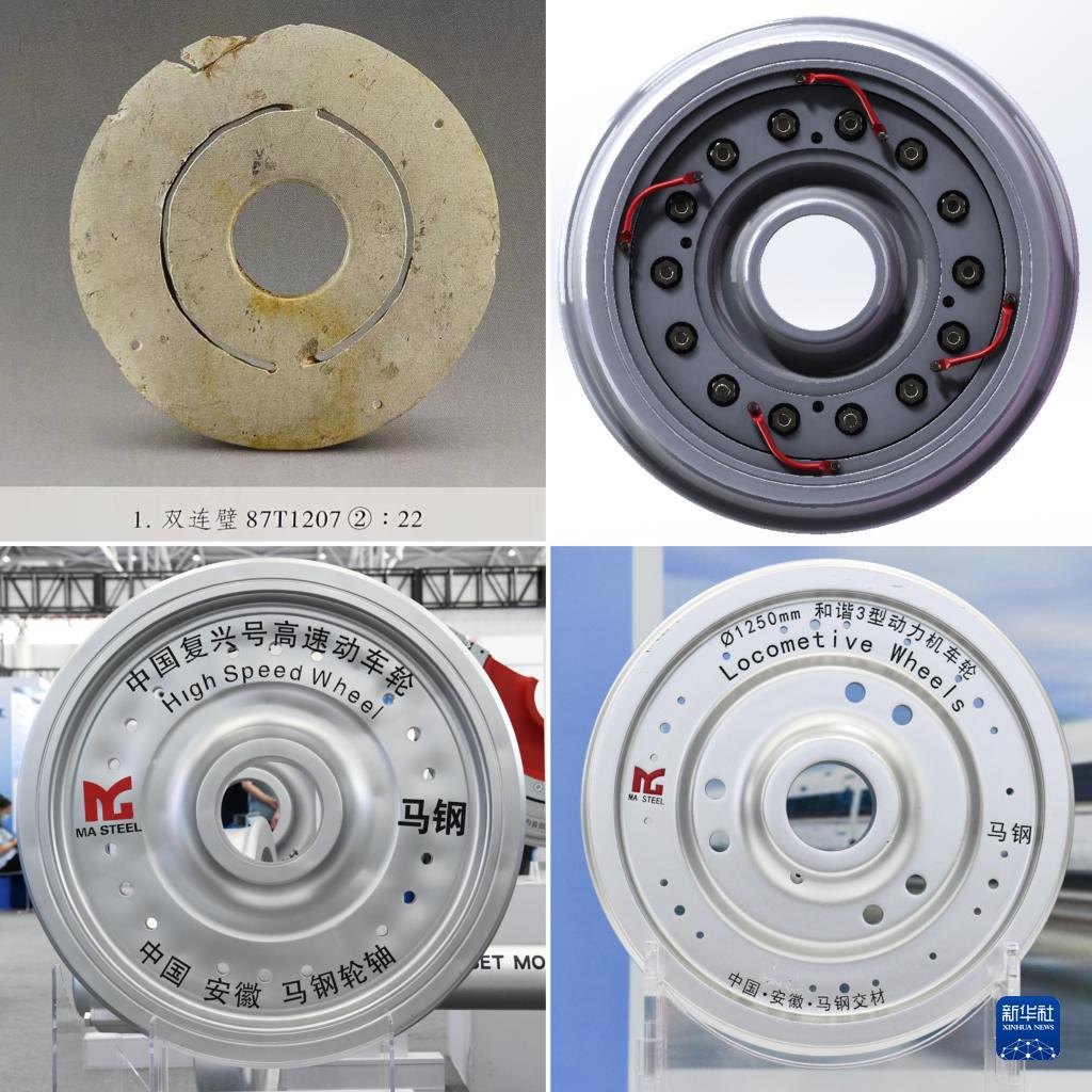 這是一張拼版照片:左上為凌家灘遺址出土的雙連璧(凌家灘遺址管理處供圖);右上為一款馬鋼彈性車(chē)輪(寶武集團馬鋼軌交材料科技有限公司供圖);左下為2022世界制造業(yè)大會(huì )上展出的中國復興號高速動(dòng)車(chē)輪模型(新華社記者張端2022年9月20日攝);右下為2022世界制造業(yè)大會(huì )上展出的和諧3型動(dòng)力機車(chē)輪模型(新華社記者黃博涵2022年9月20日攝)。