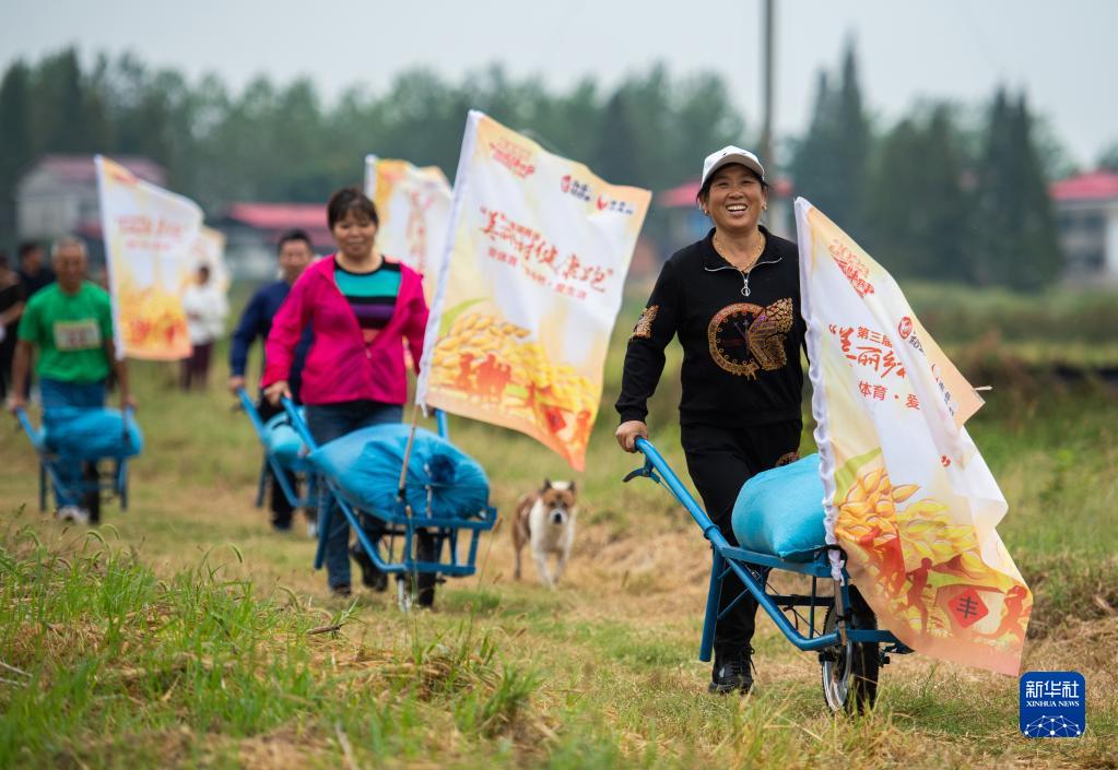 當日,湖南省益陽(yáng)市南縣麻河口鎮舉行“農民稻田趣味運動(dòng)會(huì )”,當地村民和游客通過(guò)環(huán)田跑步、收獲水稻、稻田捉鴨、斗車(chē)運糧等運動(dòng)比拼,迎接中國農民豐收節的到來(lái)。南縣是中國農民豐收節湖南分會(huì )場(chǎng)之一。