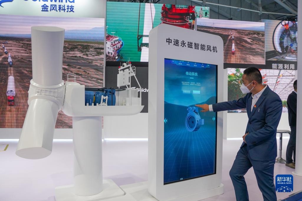 9月21日,在第七屆中國-亞歐博覽會(huì )上,新疆金風(fēng)科技股份有限公司展位的工作人員在介紹中速永磁智能風(fēng)機。