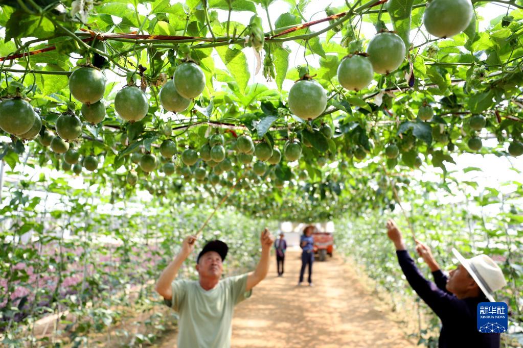 9月21日,農民在山東省青島西海岸新區海青鎮的一處水果大棚里忙碌。