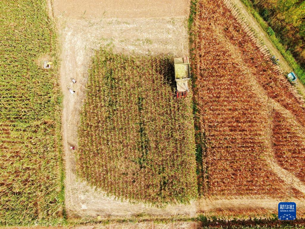 9月21日,在山東省臨沂市平邑縣卞橋鎮東荊埠村,村民駕駛收割機在田間收獲玉米(無(wú)人機照片)。