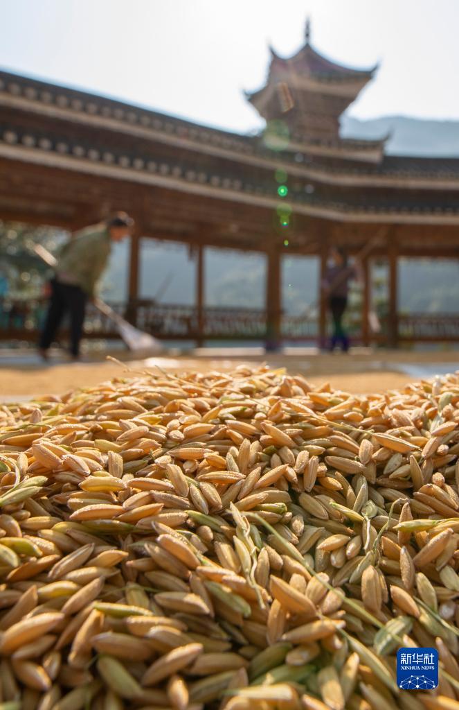貴州省從江縣剛邊壯族鄉剛邊村,村民在晾曬稻谷(9月18日攝)。