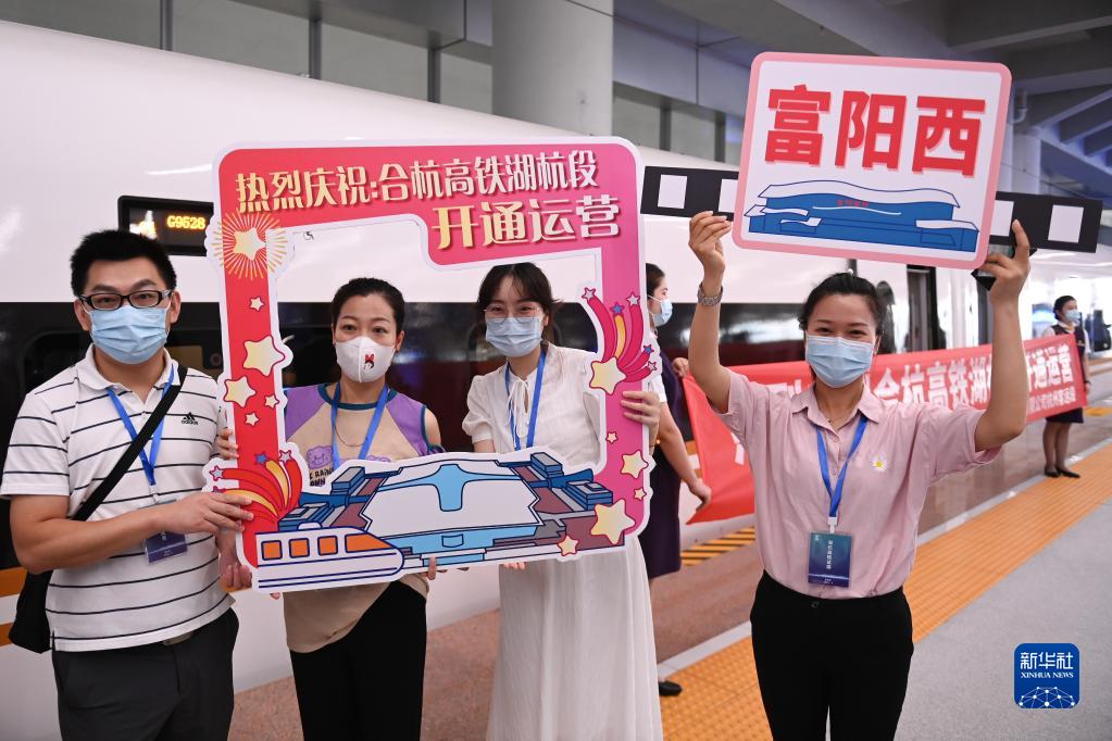 9月22日,合杭高鐵湖州至杭州段首趟列車(chē)旅客在杭州西站站臺合影留念。