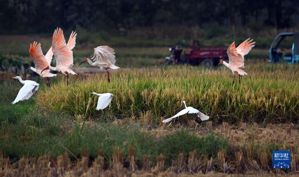 朱鹮和白鷺在陜西漢中市洋縣紙坊街道周家坎村稻田里飛翔(9月10日攝)。得益于生態(tài)環(huán)境的改善,洋縣朱鹮數量從曾經(jīng)瀕臨滅絕的7只增加到了7000多只。