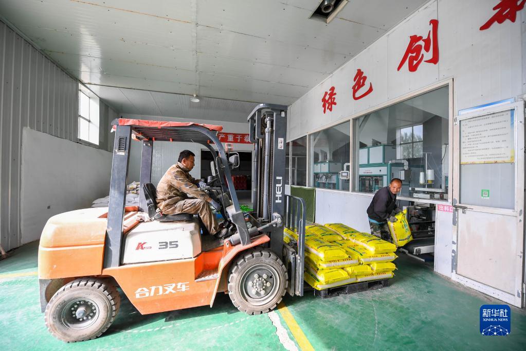 9月22日,內蒙古興安盟烏蘭浩特市義勒力特鎮的明武水稻種植專(zhuān)業(yè)合作社社員駕駛叉車(chē)搬運加工好的大米。