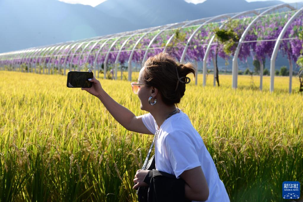 游客在云南大理洱海畔稻田里拍照留念(9月21日攝)。