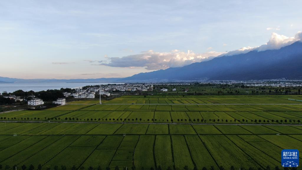 俯瞰云南大理洱海畔連片的稻田(9月21日攝,無(wú)人機照片)。