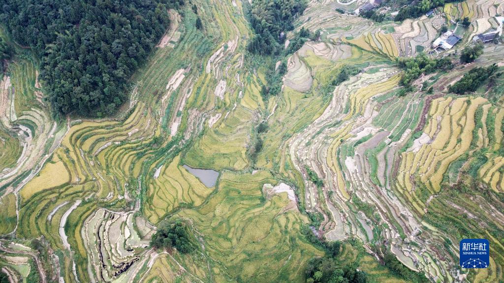 金秋時(shí)節,湖南省婁底市新化縣紫鵲界梯田的水稻進(jìn)入成熟收割期。紫鵲界梯田是世界灌溉工程遺產(chǎn)和全國首批19個(gè)重要農業(yè)文化遺產(chǎn)之一,梯田層層疊疊連綿起伏。