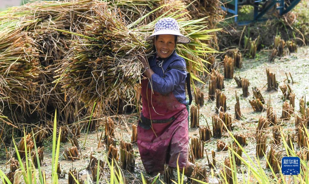 9月22日,融水苗族自治縣紅水鄉良隴村村民喜收秋稻。