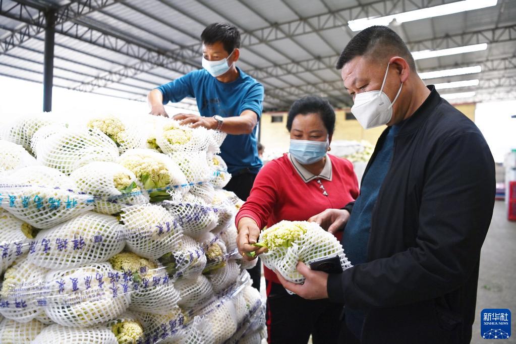 9月20日,在榆中祥龍蔬菜產(chǎn)銷(xiāo)專(zhuān)業(yè)合作社,豆俊蘭(中)和商家查看蔬菜品質(zhì)。