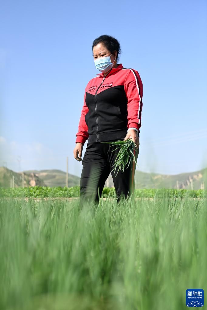 9月21日,在榆中祥龍蔬菜產(chǎn)銷(xiāo)專(zhuān)業(yè)合作社種植基地,豆俊蘭查看小蔥長(cháng)勢。