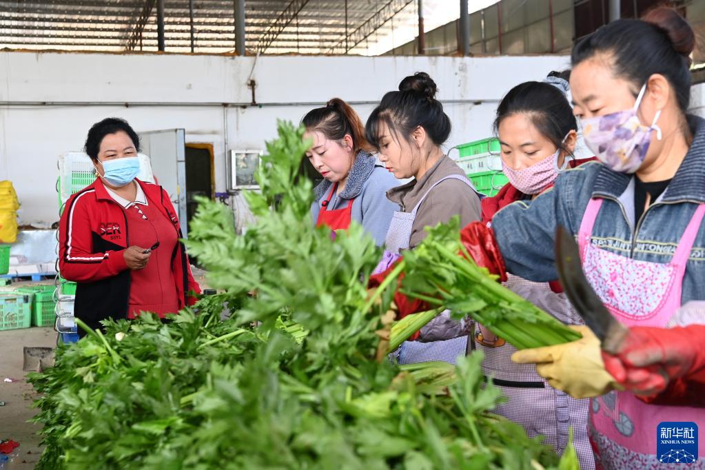 9月21日,在榆中祥龍蔬菜產(chǎn)銷(xiāo)專(zhuān)業(yè)合作社冷庫,豆俊蘭(左一)安排芹菜分揀事宜。
