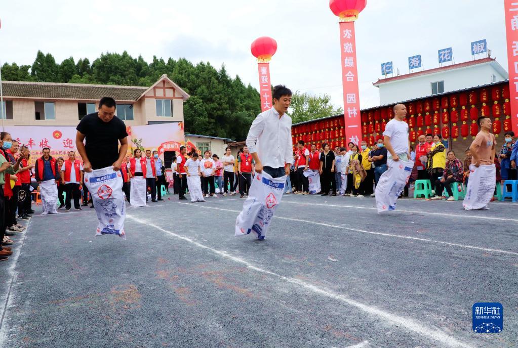 9月21日,在四川省眉山市仁壽縣方家鎮農民趣味運動(dòng)會(huì )上,村民們參加跳糧袋比賽。