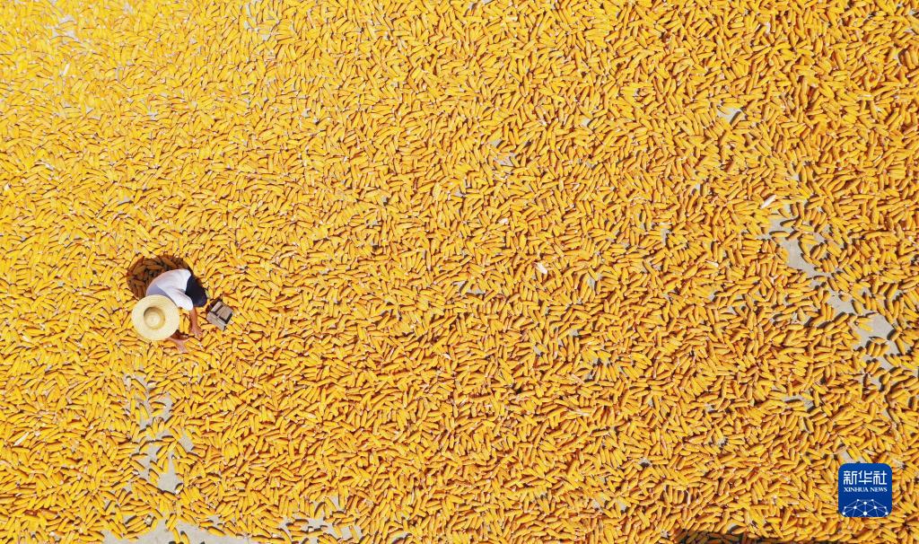 9月22日,在山東省臨沂市郯城縣郯城街道,農民晾曬收獲的玉米(無(wú)人機照片)。