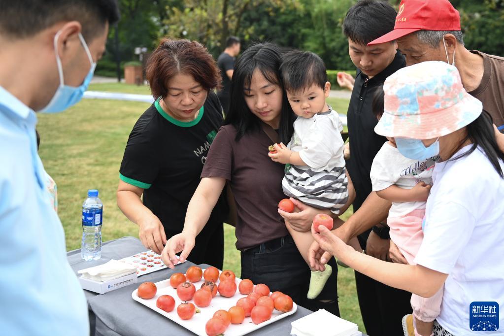 9月23日,市民和游客在西溪濕地品嘗成熟的火柿。