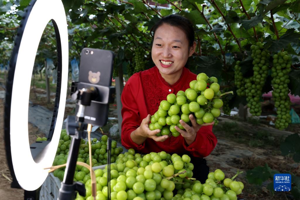 9月20日,在山東省棗莊市孟莊鎮大郭莊村,“90后”牛玲玉在葡萄園直播平臺上推介銷(xiāo)售陽(yáng)光玫瑰葡萄。牛玲玉大學(xué)畢業(yè)后返鄉創(chuàng )辦了暢想家庭農場(chǎng),其種植的葡萄因屬綠色食品備受消費者青睞。