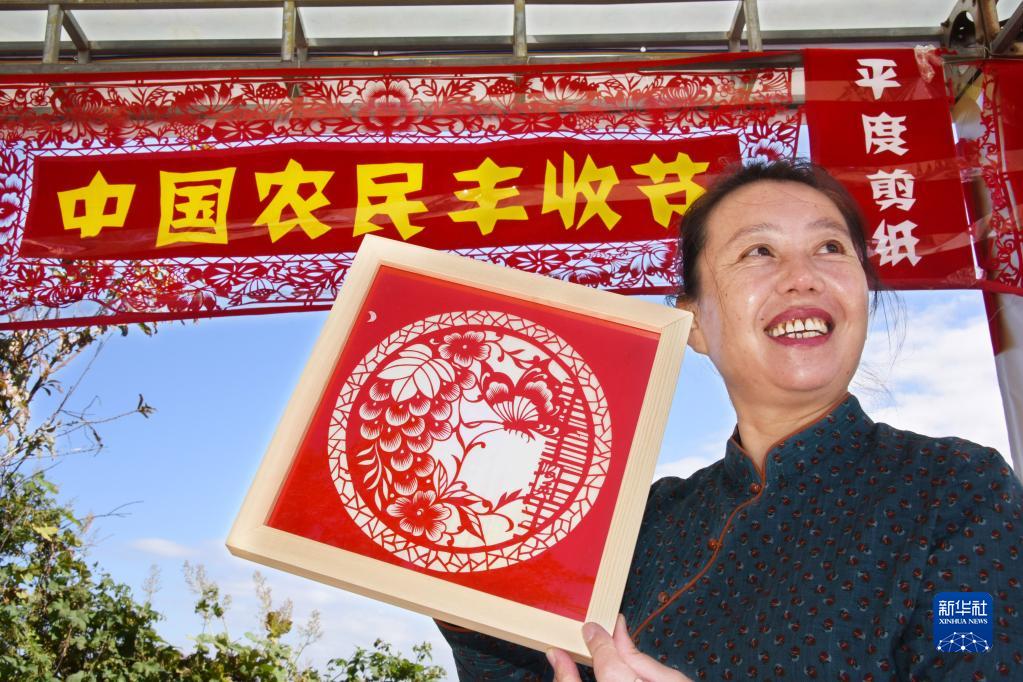 9月23日,剪紙藝人王海英展示豐收主題作品。