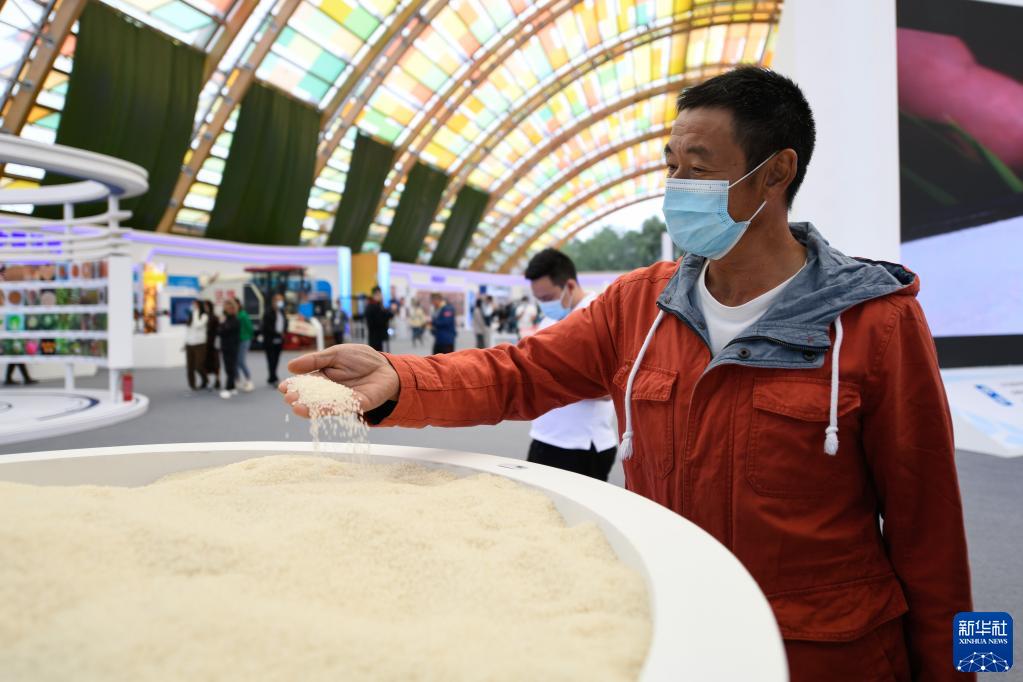 9月23日,在四川省成都市天府農業(yè)博覽園“大國糧倉科技館”內,市民在觀(guān)看展示的大米。