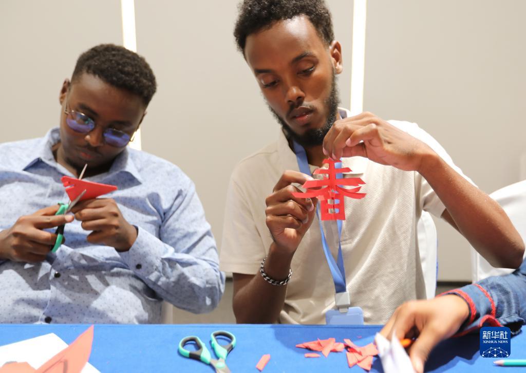 9月18日,在吉布提首都吉布提市,學(xué)員們學(xué)習剪紙。