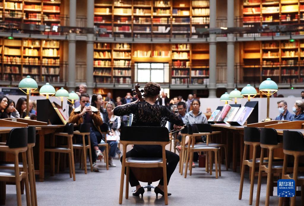 9月17日,在位于巴黎的法國國家圖書(shū)館黎塞留館,人們在“橢圓大廳”聆聽(tīng)大提琴家的表演。
