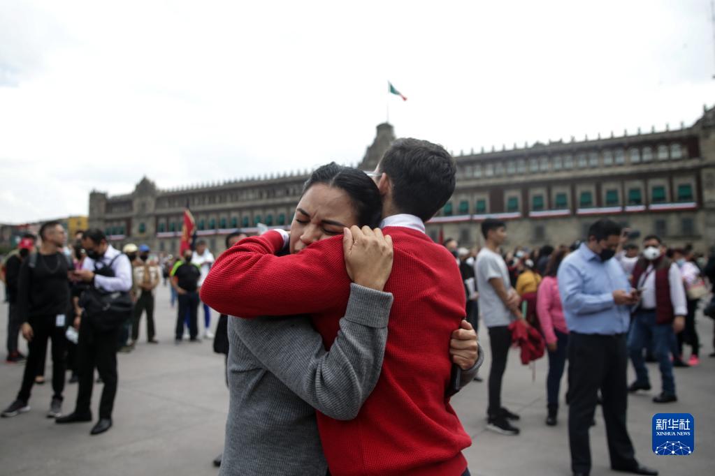 9月19日,在墨西哥首都墨西哥城,室外避險的人們相互安慰。