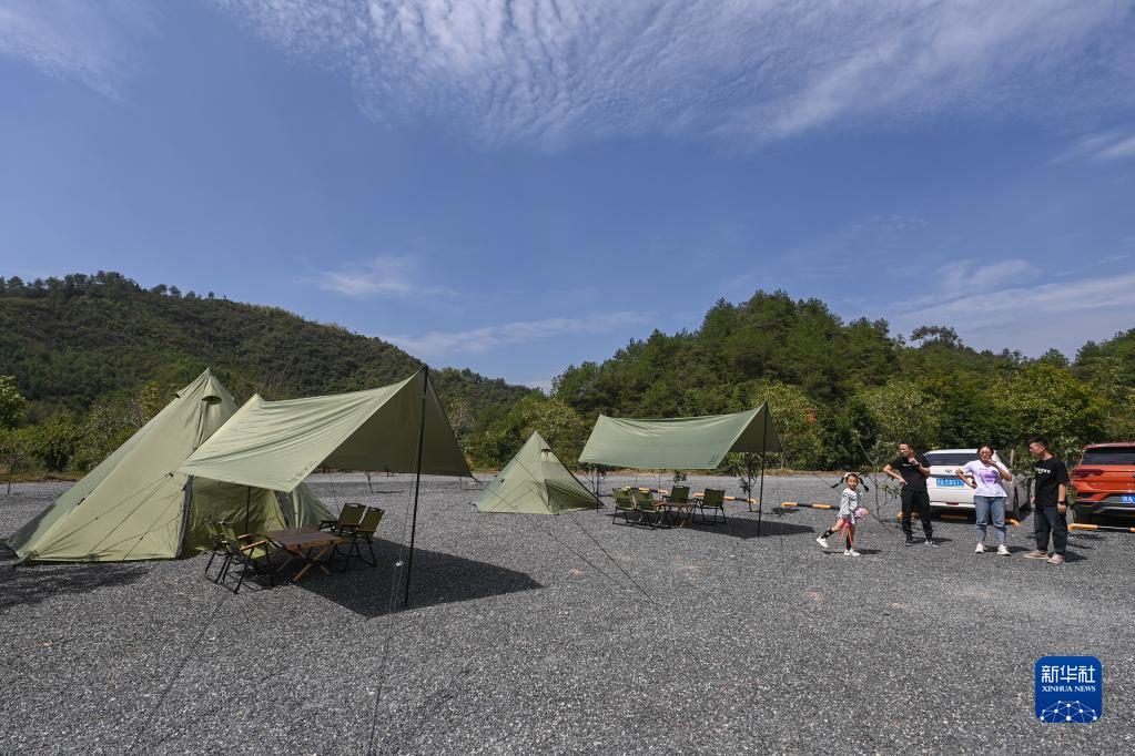 9月24日,在杭州市臨安區太陽(yáng)鎮上莊村的牧光谷露營(yíng)基地,“90后”負責人何威(右一)在和游客互動(dòng)。該基地是2022年5月剛投入運營(yíng)的網(wǎng)紅露營(yíng)基地,帶動(dòng)周邊30余名農戶(hù)就業(yè)。