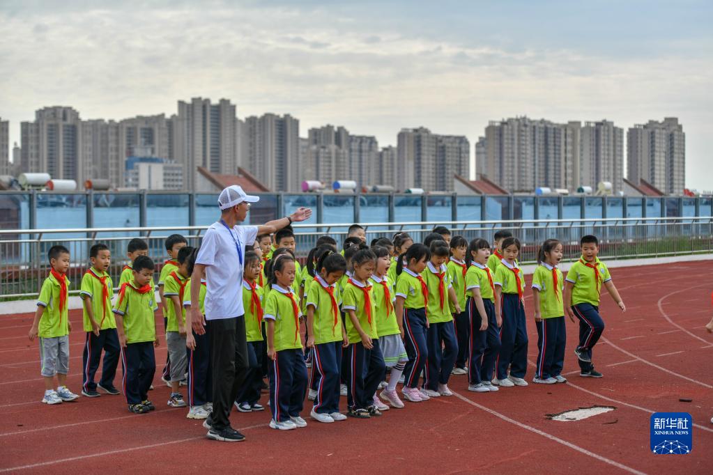9月20日,齊河縣第六小學(xué)學(xué)生在空中運動(dòng)場(chǎng)上體育課。這所地處鬧市的學(xué)校將地下停車(chē)、地上教學(xué)、運動(dòng)場(chǎng)地分層穿插布局巧妙融合,節地率達到54%。