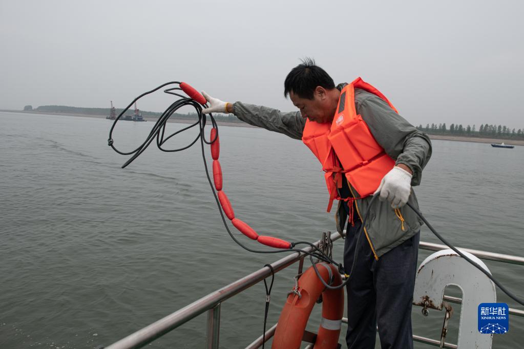9月23日,科考人員在湖北石首水域通過(guò)微型聲信號記錄儀進(jìn)行探測工作。