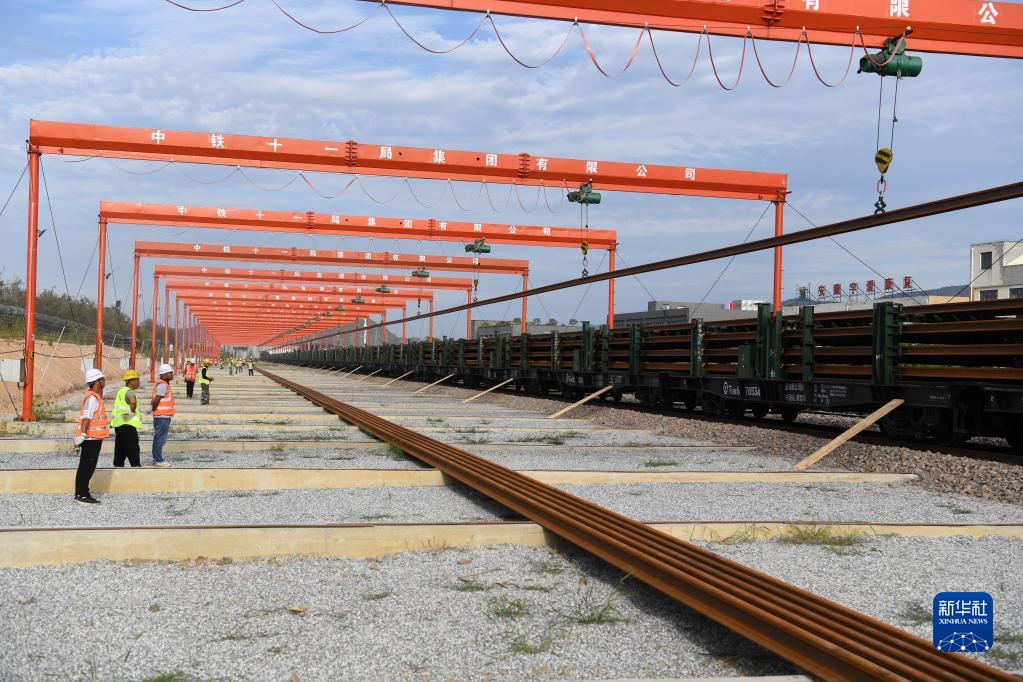 9月24日,在中鐵十一局池黃鐵路鋪軌基地,工作人員進(jìn)行卸軌作業(yè)。