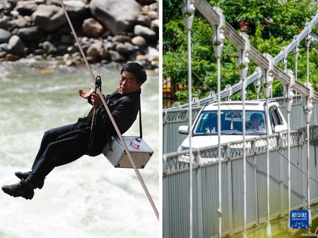 這是一張拼版照片:左圖為2011年2月20日,“溜索醫生”鄧前堆在怒江州福貢縣石月亮鄉拉馬底村溜索到江對岸出診(新華社記者秦晴攝)。右圖為2022年9月14日,鄧前堆出診歸來(lái)駕駛私家車(chē)過(guò)橋(新華社記者江文耀攝)。新華社發(fā)