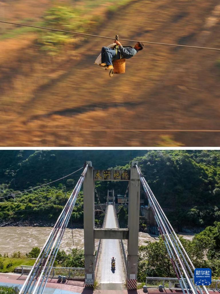 這是一張拼版照片:上圖為2013年2月2日,在云南省怒江州瀘水市六庫街道,一名居民背著(zhù)背簍溜索過(guò)江(新華社記者王長(cháng)山攝)。下圖為2022年9月13日,瀘水市居民騎摩托車(chē)通過(guò)大興地橋(無(wú)人機照片,新華社記者江文耀攝)。新華社發(fā)