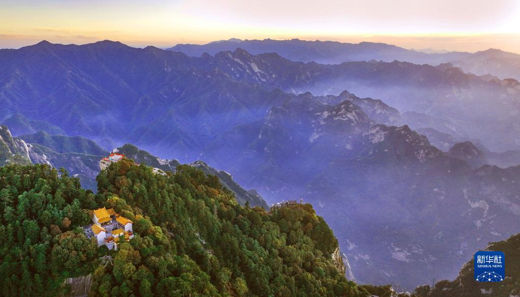 9月25日,夕陽(yáng)西下,雨后初霽的西岳華山,云霧縈繞,宛如仙境(無(wú)人機照片)。
