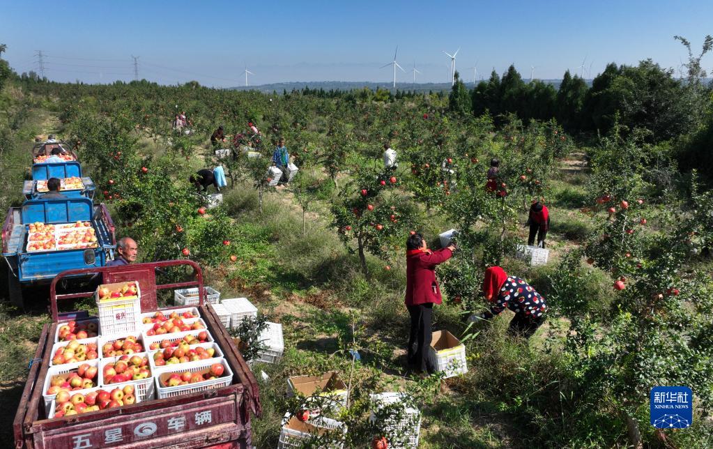 9月26日,在陜西省潼關(guān)縣港口社區東臺塬,裕興農業(yè)開(kāi)發(fā)有限公司的員工在采摘軟籽石榴(無(wú)人機照片)。