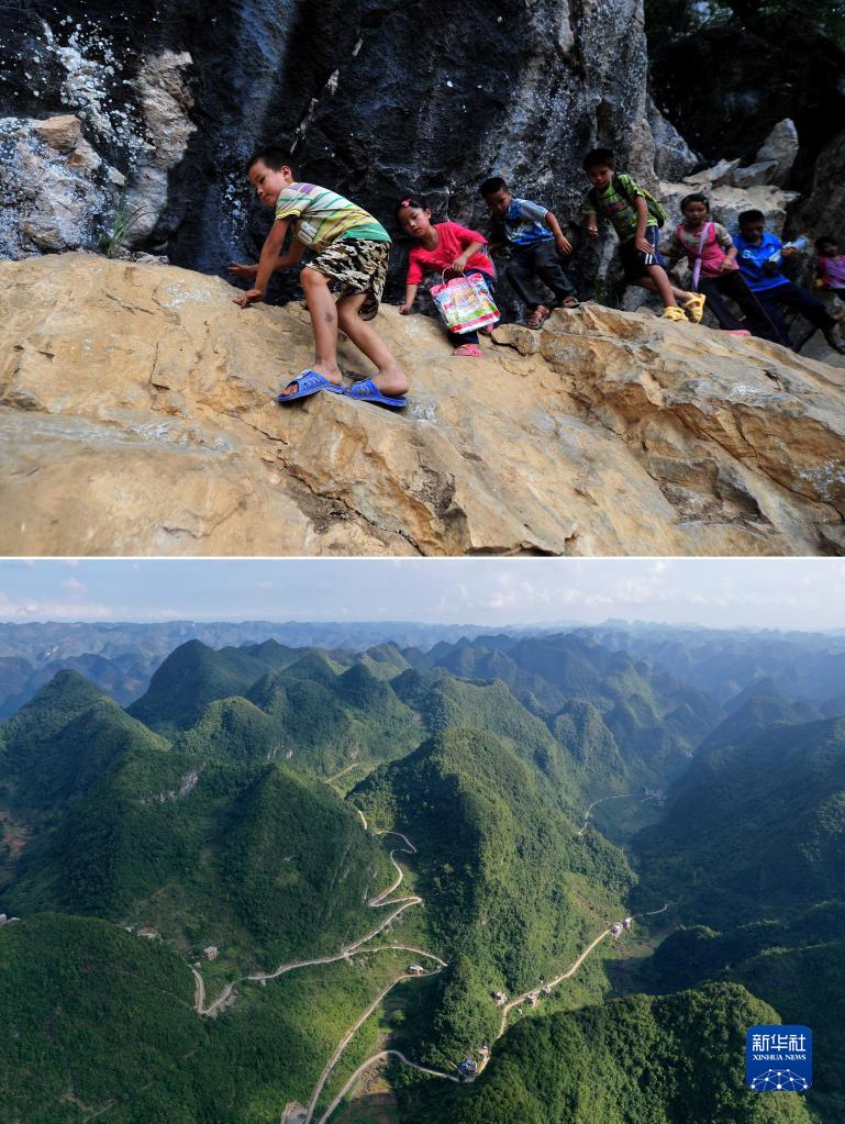 上圖:在廣西大化瑤族自治縣板升鄉弄雷村哈保屯,孩子們放學(xué)后爬懸崖回家(2012年9月5日攝);下圖:如今的弄雷村已實(shí)現屯屯通公路(2022年8月23日攝)。當年爬懸崖求學(xué)的孩子們,有些已經(jīng)考上大學(xué),有些還在讀高中,有的讀中專(zhuān)(拼版照片)。