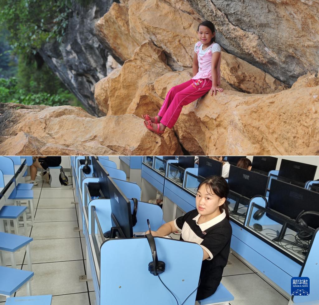 上圖:在廣西大化瑤族自治縣板升鄉弄雷村哈保屯,11歲的蒙秋艷在懸崖邊休息,這一處約300米長(cháng)的半山懸崖,是她讀小學(xué)期間每天都要走的路(2012年9月5日新華社記者黃孝邦攝);下圖:已經(jīng)實(shí)現大學(xué)夢(mèng)想的蒙秋艷,就讀于廣西醫科大學(xué),這是她在學(xué)校的語(yǔ)音室學(xué)習(新華社發(fā),2022年9月5日韋婷婷攝)(拼版照片)。