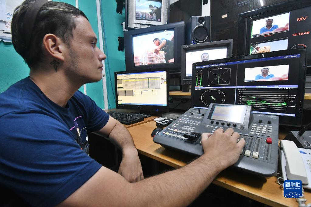 9月22日,在古巴首都哈瓦那,古巴國家電視臺多視覺(jué)頻道的技術(shù)人員在演播室準備播放中國紀錄片《我的鄉村故事》。